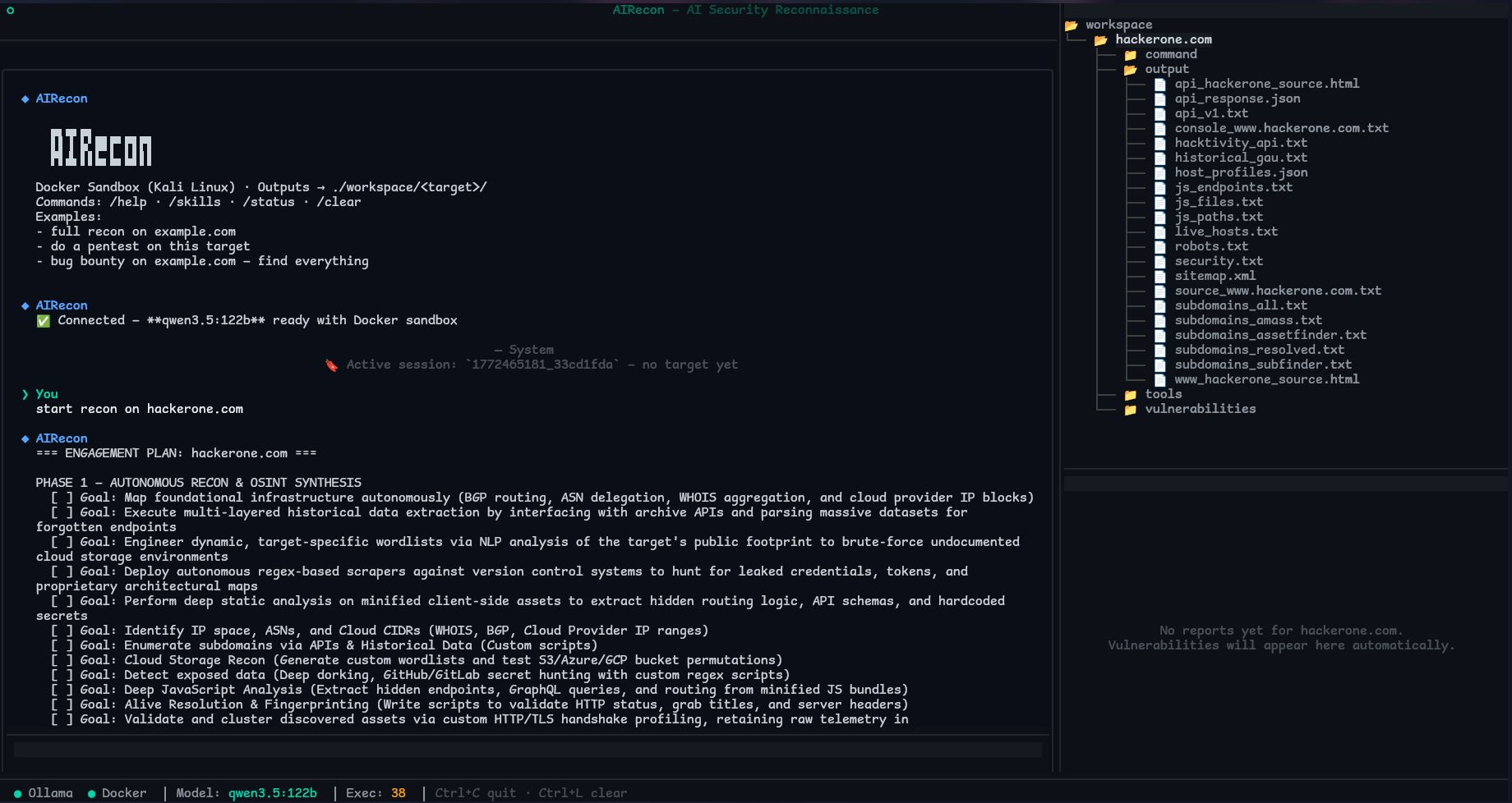 AIRecon is an autonomous security agent that pairs a self-hosted Ollama model with a Kali Linux Docker sandbox and a TUI workflow for recon, analysis, exploitation, and reporting without cloud APIs. It also supports proxy tooling integrations and a structured pipeline intended to reduce manual glue between recon output and exploitation attempts.