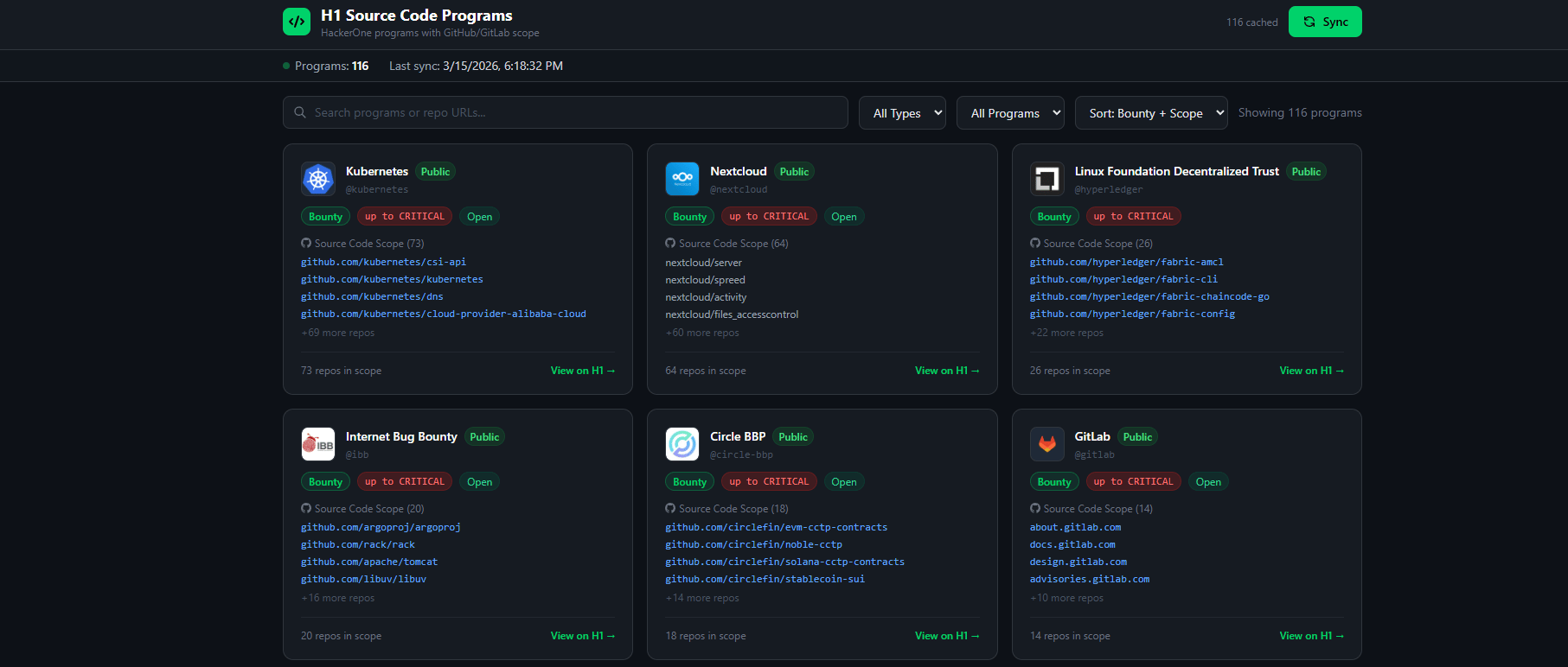 This app aggregates HackerOne programs that include GitHub/GitLab/Bitbucket repositories in structured scope, making it easier to target code-review surfaces. It syncs via the HackerOne API, caches results, and provides a searchable UI with direct links to in-scope repos.